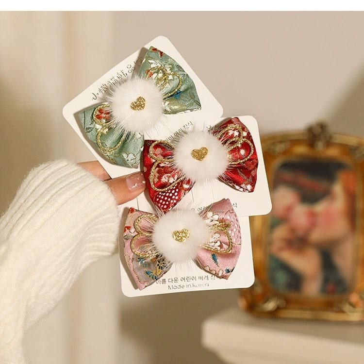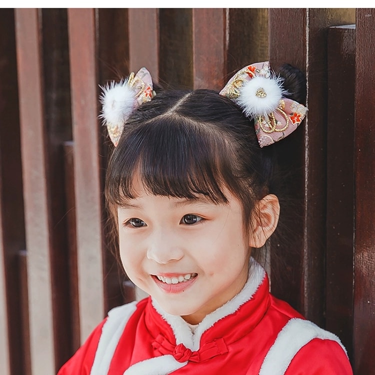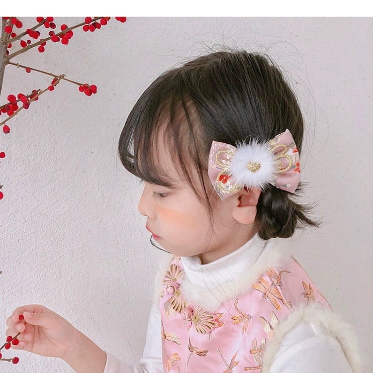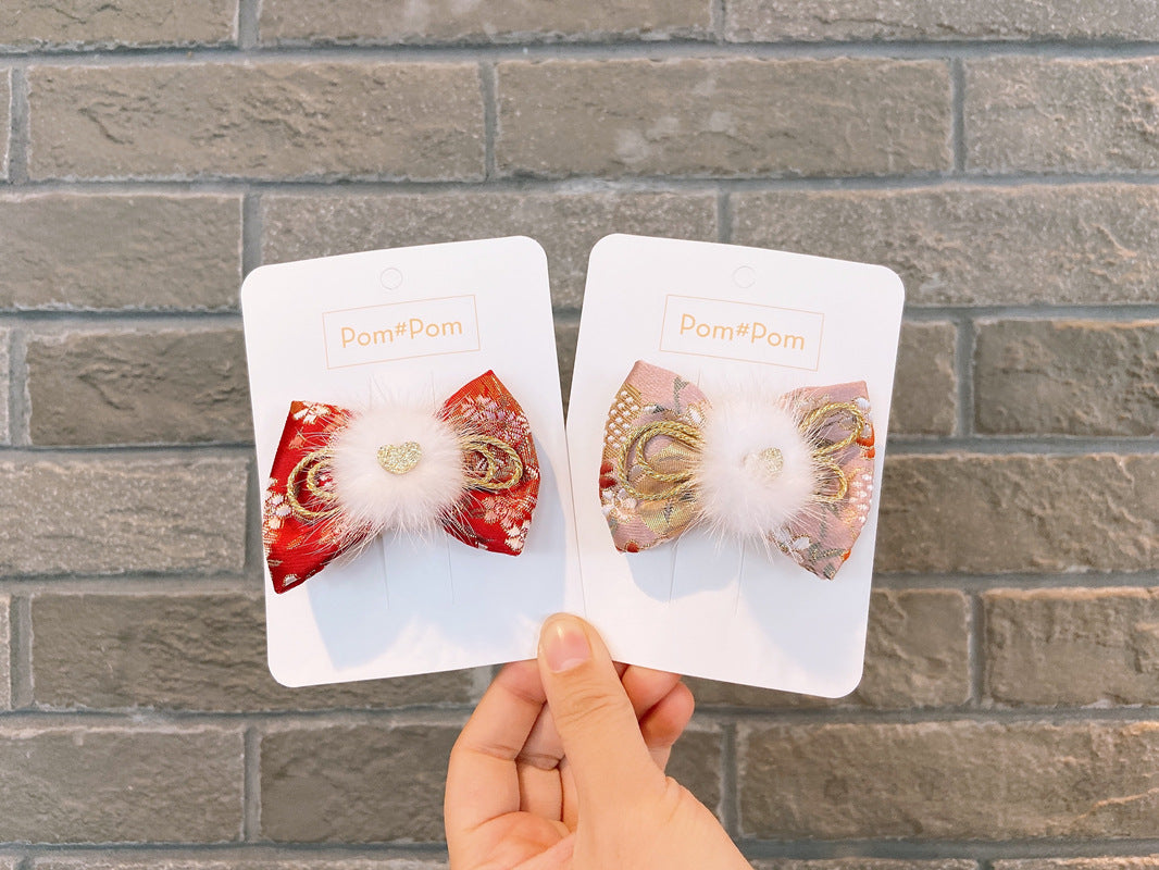 1 x Japanese Style Pom Pom Floral Hair Bows - Pink