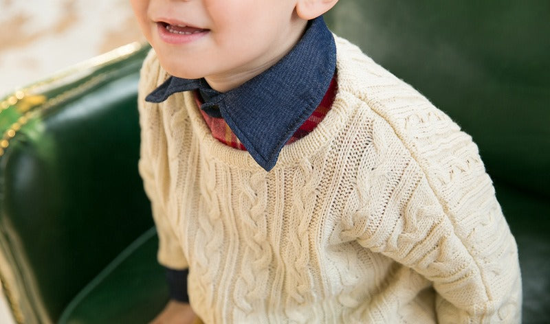 Boy soft, navy blue light-weight cotton knitted jumper. It has a classic cable knit pattern with puffed sleeves.