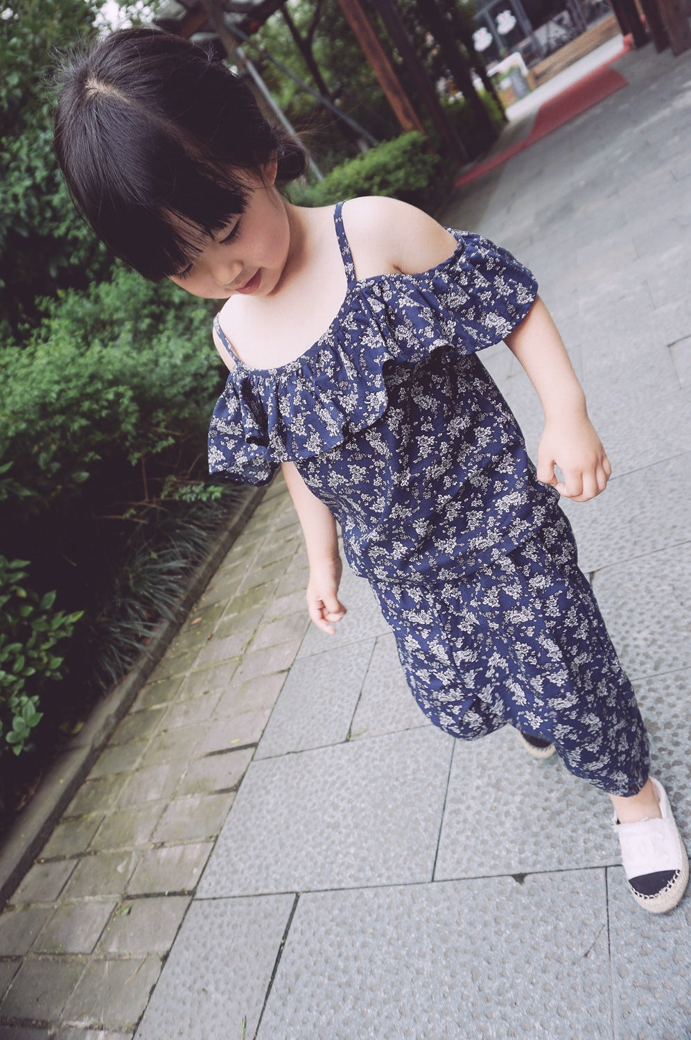 Girls Floral Off Shoulder Blouse and Short Set- Navy