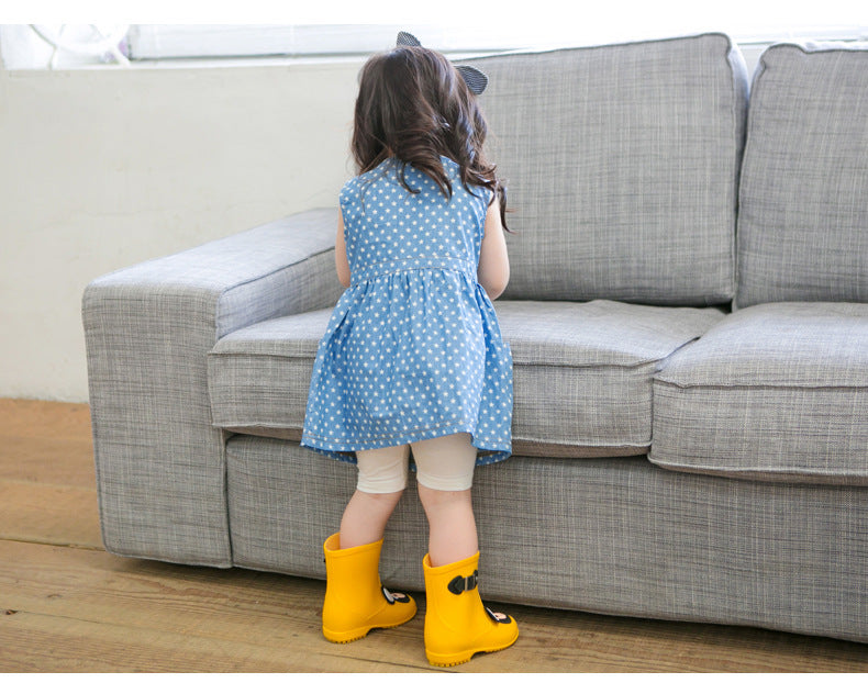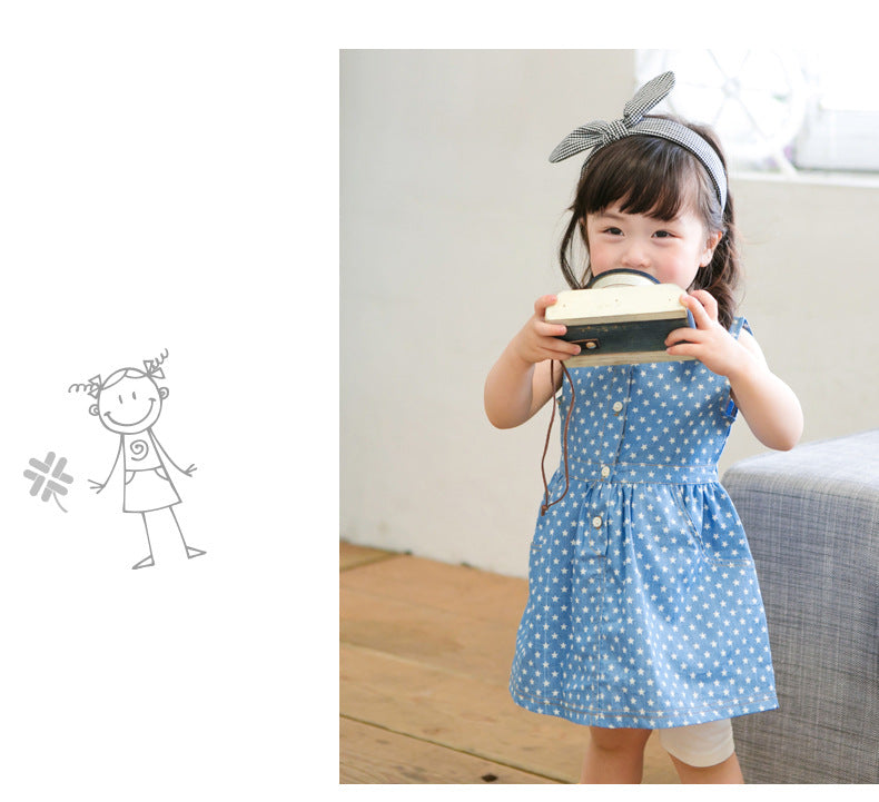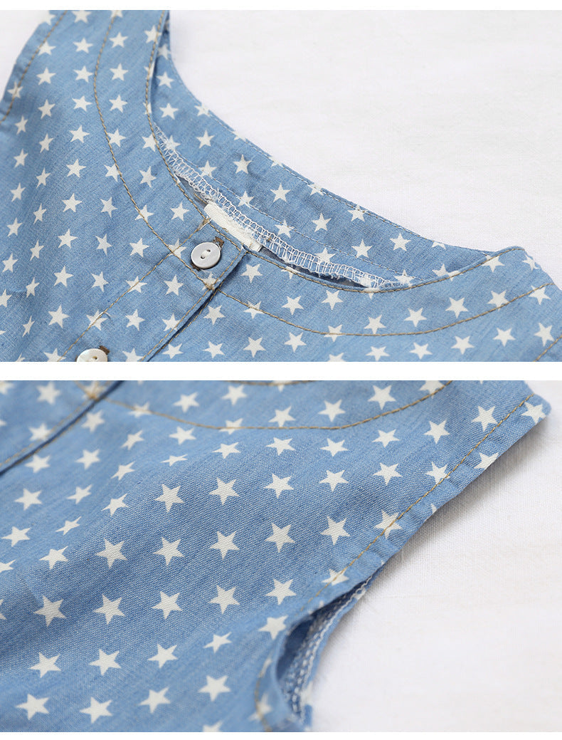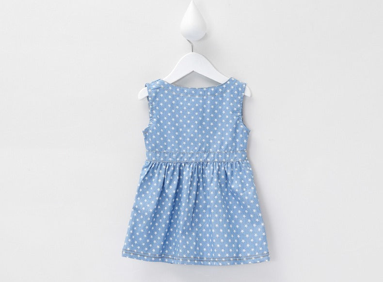 Girls blue, sleeveless dress by Suzy, made in a soft cotton, with a white star pattern. This lovely dress has a fitted bodice and brown trim around the placket. It fastens with buttons at the front, has a gathered waist and a flared, full skirt.