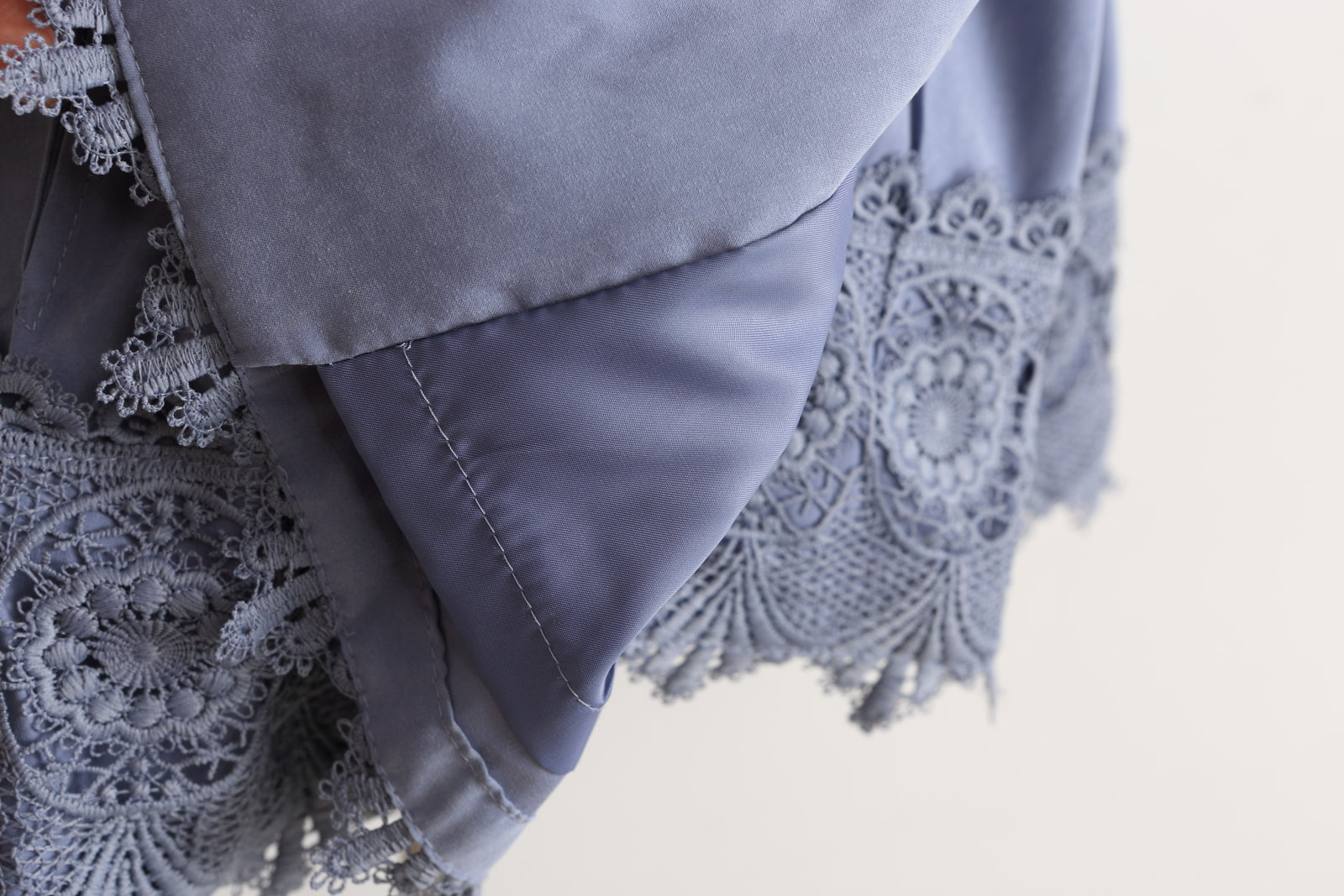 Girls Lavender Blue Mini-me trench coat by Amber, with a Broderie hem. It is made in cotton, gathered in pleats from the waist and fastening with buttons and a belt. The coat is part-lined in polyester silk. Suitable for spring and autumn.
