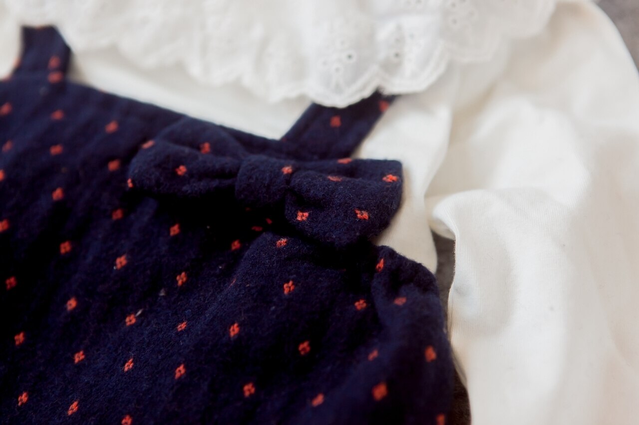 Girls navy pinafore dress and white blouse set by Baby C. The dress is made in super soft brushed twill, with cotton lining and a bow on the front. The top is made in soft cotton jersey with button fastenings on the front. Suitable for cool weather.