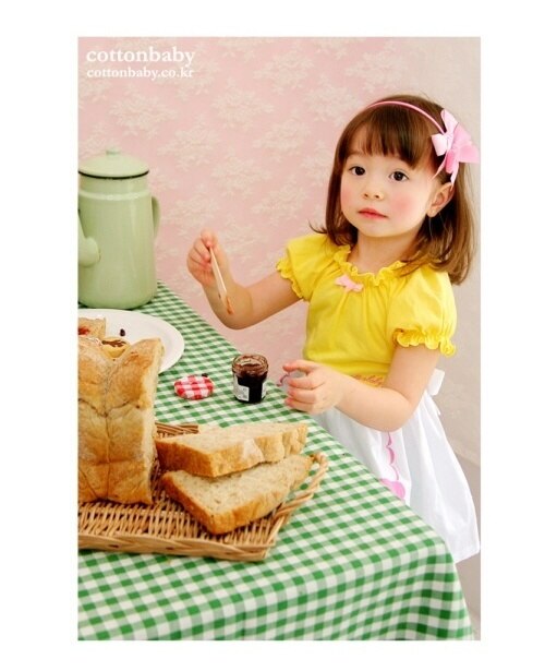 A special dress for girls by Cotton Baby from South Korea, made and lined in the softest cotton. This classical dress has a fruit print on the detachable apron, a ruffled collar, cute puff sleeves, and a pink bow on the chest.