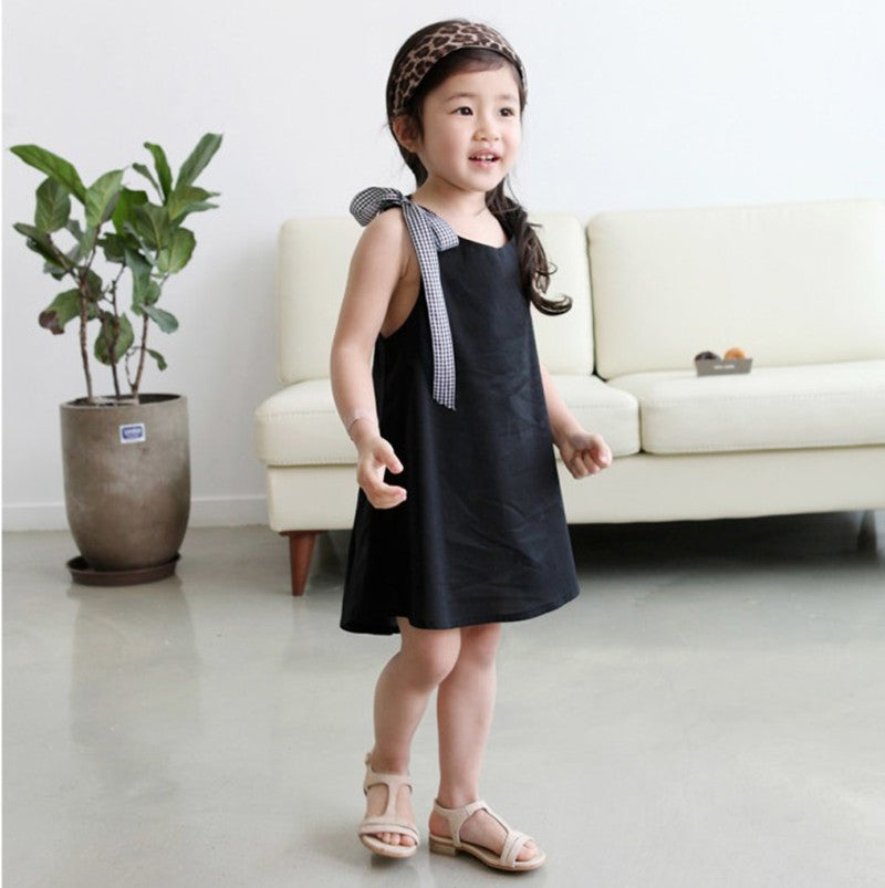 Girls Checked Bow Cotton Black Dress